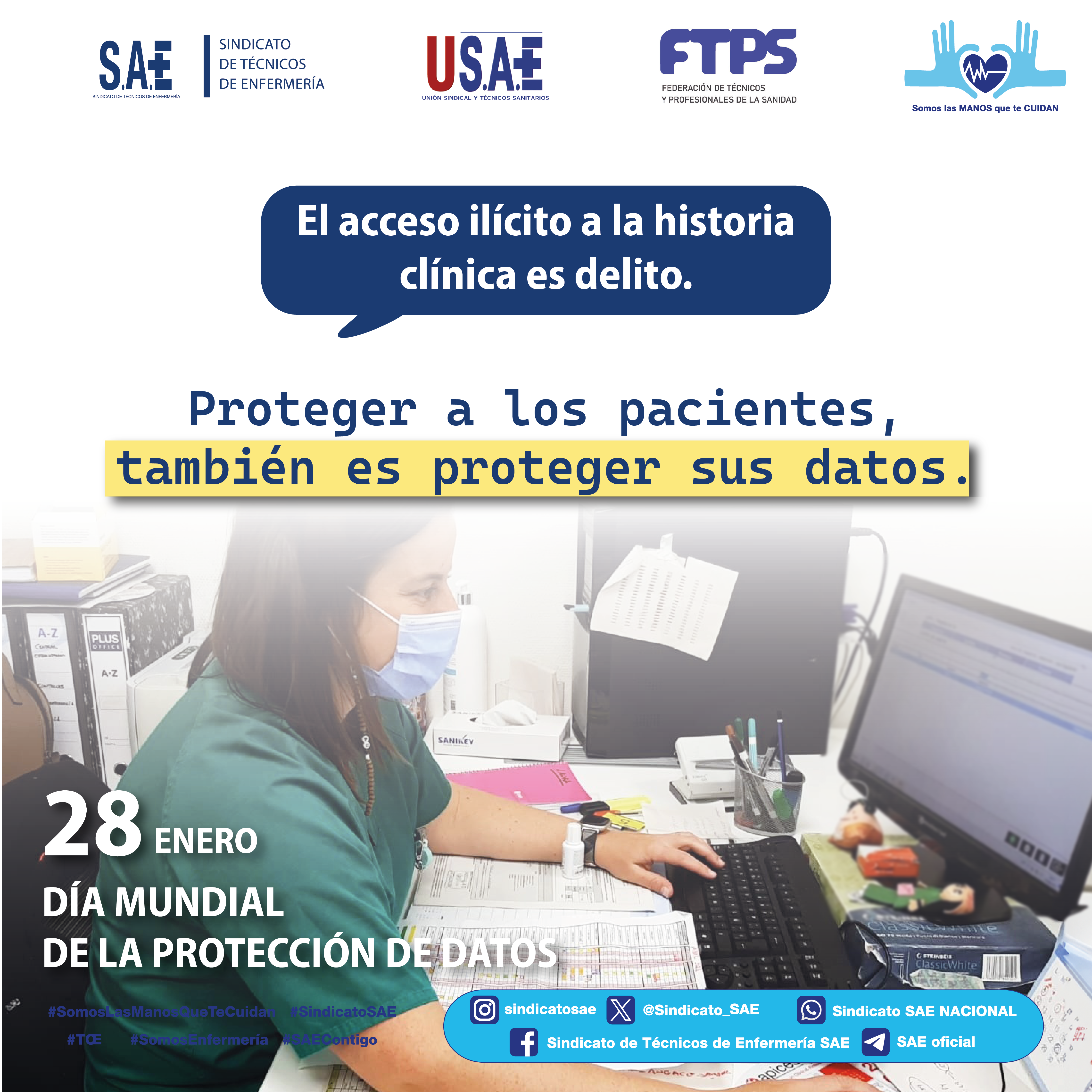 Nacional, 27 de enero de 2026.- El Sindicato de Técnicos de Enfermería (SAE) se suma este año al Día Europeo de la Protección de Datos para concienciar a los profesionales sanitarios sobre la importancia de preservar la privacidad de los pacientes y usuarios del Sistema Nacional de Salud, así como del resto de instituciones residenciales o centros privados en los que desempeñen su trabajo.