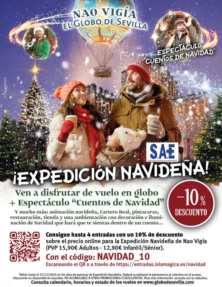 Una autentica “Expedición navideña” en la que podrás disfrutar de vuelo en globo + el espectáculo “Cuentos de Navidad”, y mucho más: animación navideña, Cartero Real, pintacaras, restauración, tienda y una decoración muy navideña y…¡¡¡NIEVE en Sevilla!!!!