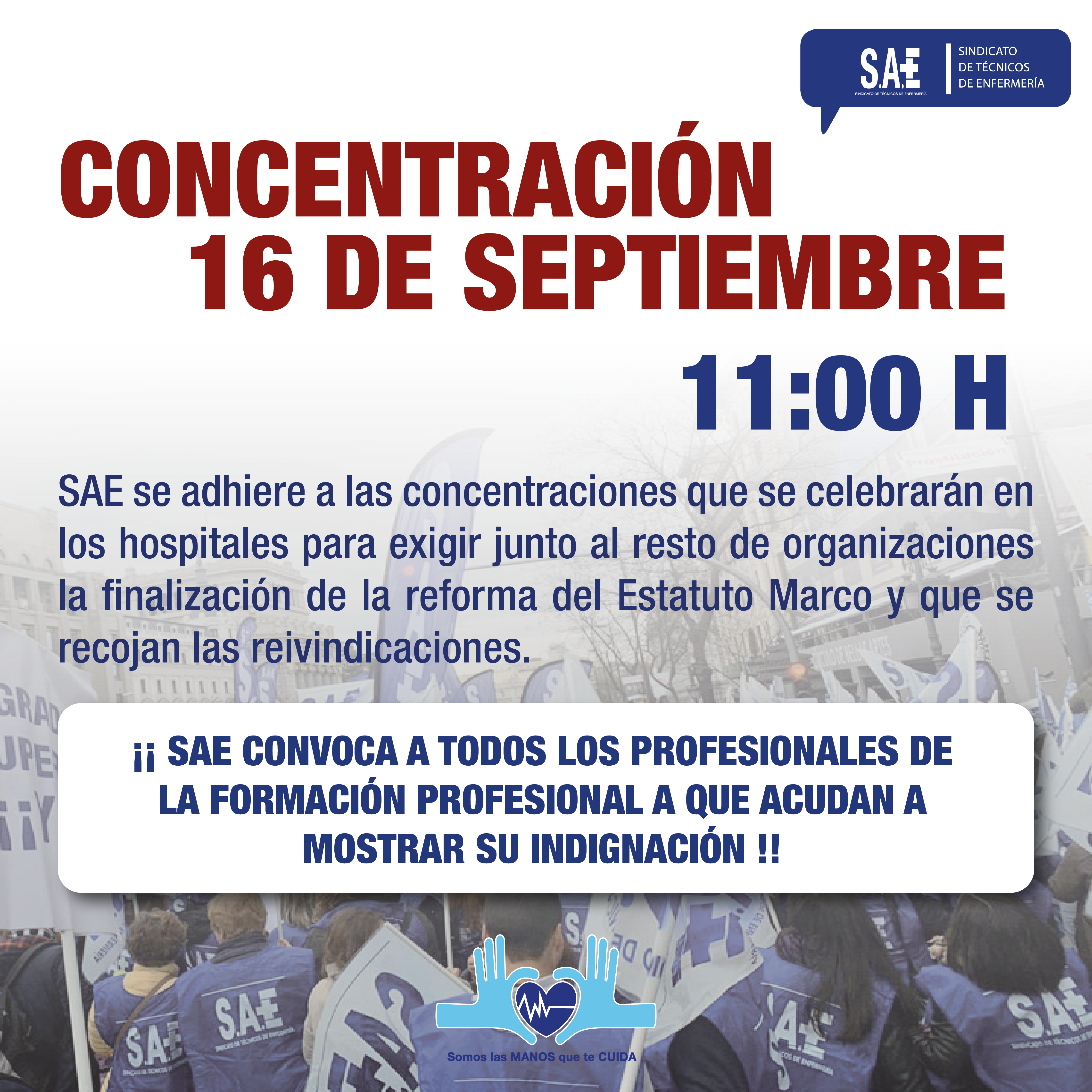 Madrid, 11 de septiembre de 2025.- El Sindicato de Técnicos de Enfermería (SAE) se ha sumado a las concentraciones convocadas para el día 16 de septiembre en los hospitales para exigir la finalización de la negociación de la reforma del Estatuto Marco, la norma básica que regula las condiciones laborales del personal del Sistema Nacional de Salud.