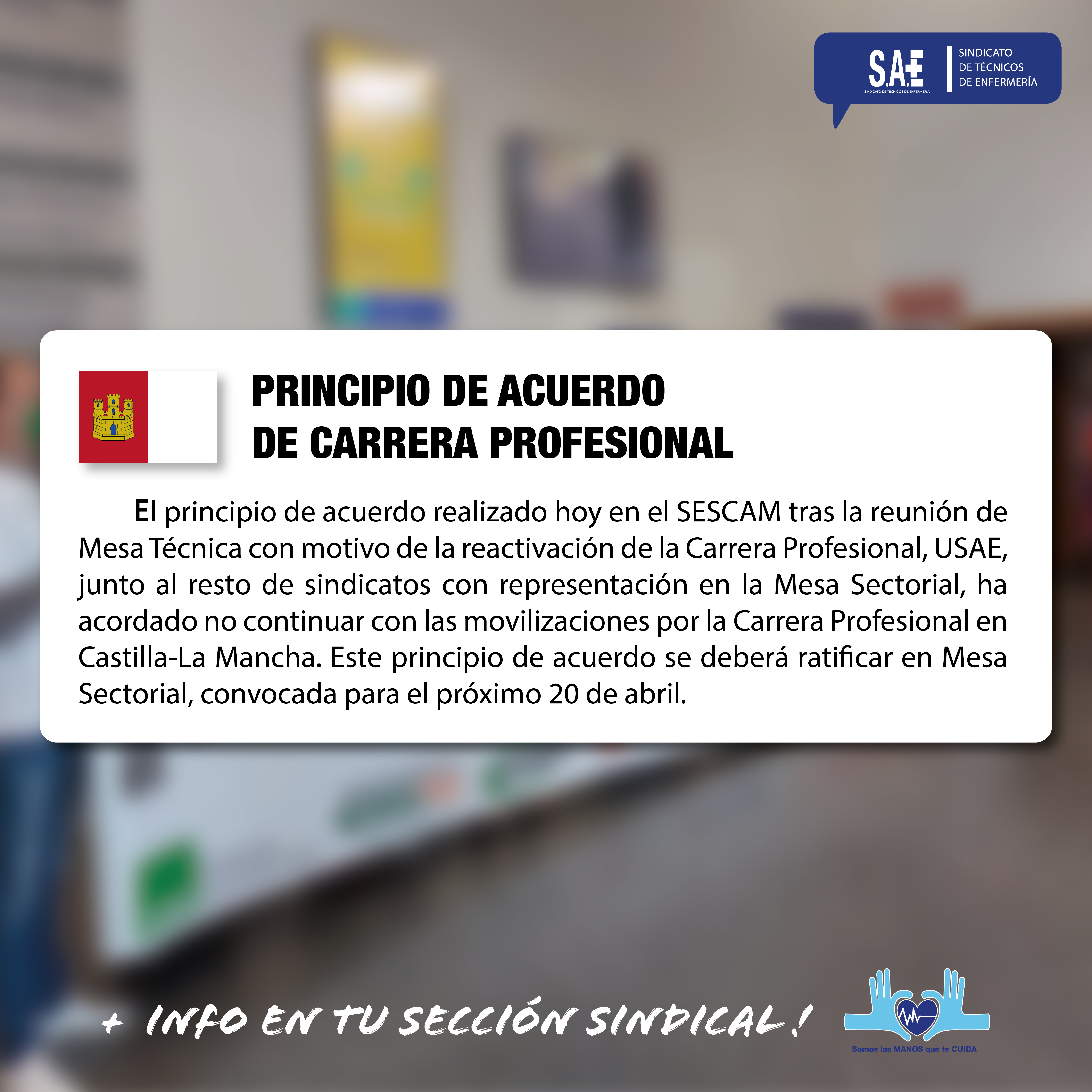 El principio de acuerdo realizado hoy en el SESCAM tras la reunión de Mesa Técnica con motivo de la reactivación de la Carrera Profesional, USAE, junto al resto de sindicatos con representación en la Mesa Sectorial, ha acordado no continuar con las movilizaciones conjuntas por la Carrera Profesional en Castilla-La Mancha. Este principio de acuerdo se deberá ratificar en Mesa Sectorial, convocada para el próximo 20 de abril.
