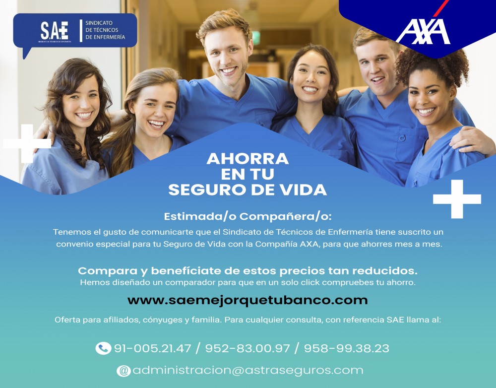 El Sindicato de Técnicos de Enfermería tiene contratado con Astra Seguros un Seguro Colectivo de Vida de la Compañía AXA para afiliados, cónyuges y familia.
